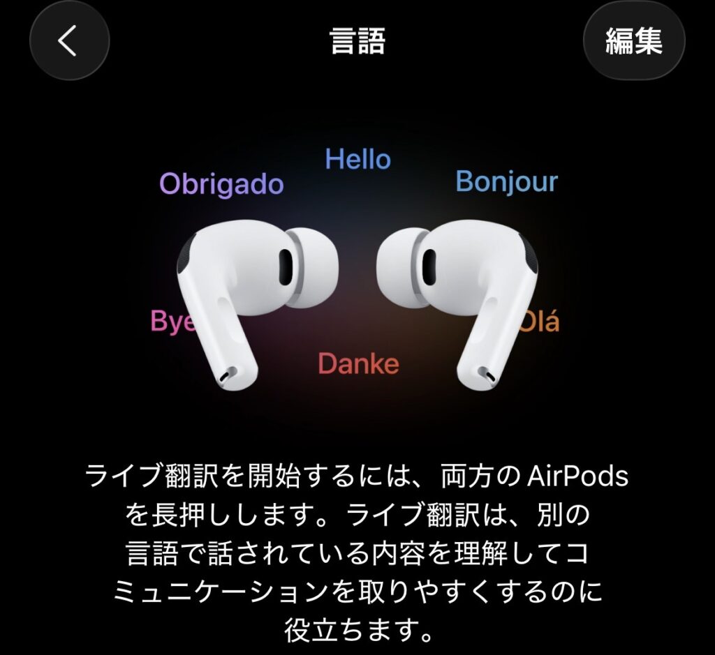 airpods の設定がライブ翻訳の設定にいくと「両方の airpods を長押しします。」とあるので、両方の本体をぐにっとすると、Siri 声で「言語のダウンロードが必要です」と警告されるものの、言語(自分の言語と翻訳する言語)をダウンロードしても、「言語のダウンロードが必要です」と繰り返し言われるだけ。