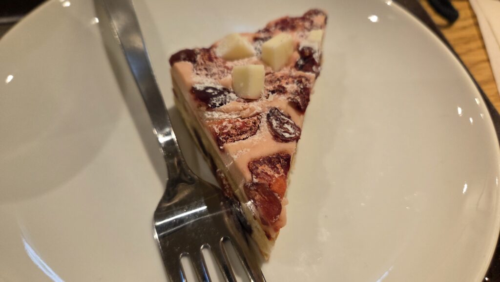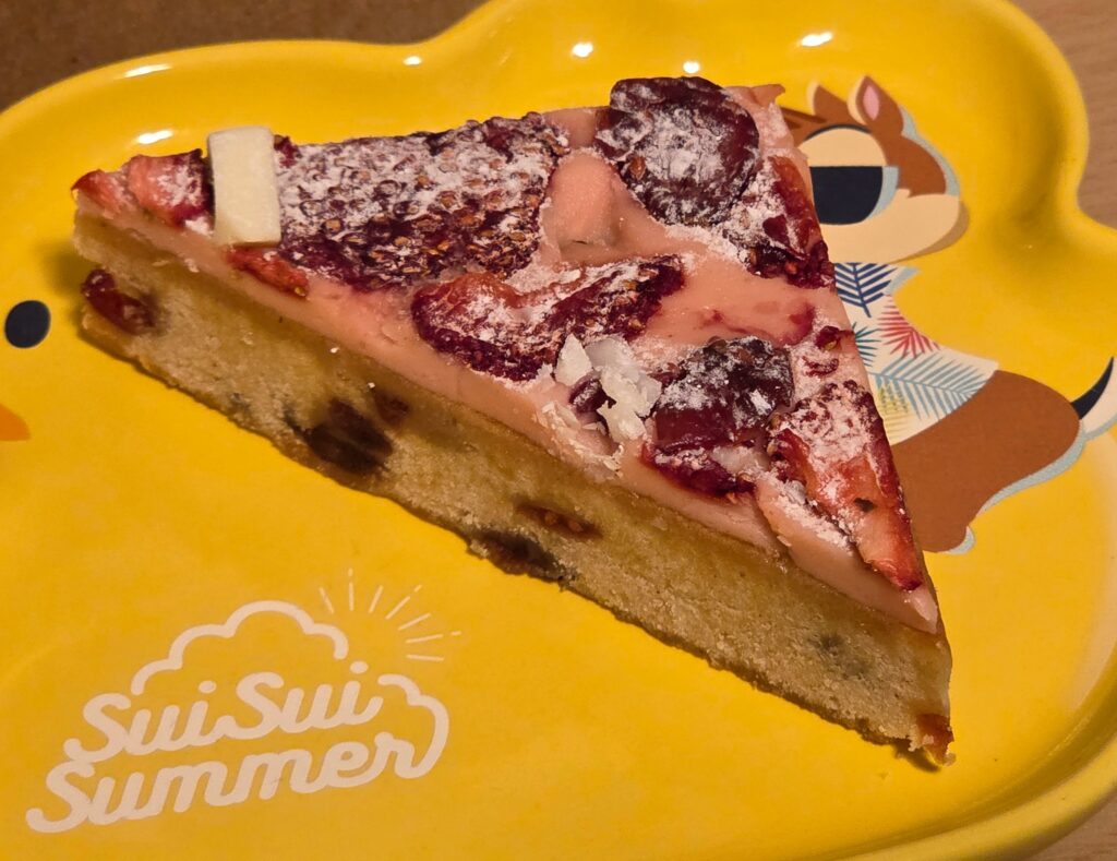 ストロベリーとクランベリーの赤が鮮やかで、ホワイトチョコチャンクとトッピングで雪のよう。