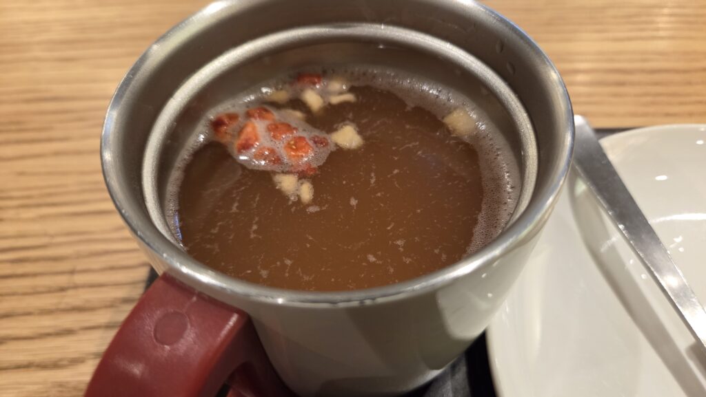 温かいアップルジュースなんですが、仕上げる時に店員さんがトッピングのように入れてくれるんですが、シナモンやオレンジピール、クランベリーも入っているかも香りがしました、が入っていて、フレーバーと見た目のアクセントになっています。