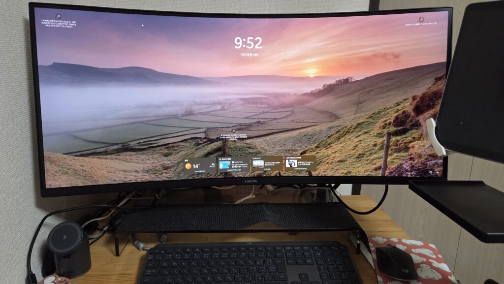 Switch2 自体は ウルトラワイドの解像度に対応していませんが、横伸びして表示され、湾曲の効果もあって没入感は感じられました。