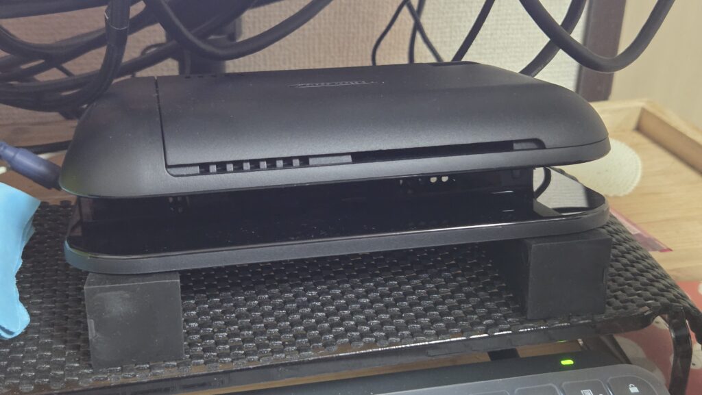 Switch2 の置き場をモニターの下にしたかったのですが、モニター台(実際モニターは エルゴトロンのモニターアームで浮いているので もうモニター台ではないのですが)を置いているので、モニター下のスペースが限られます。