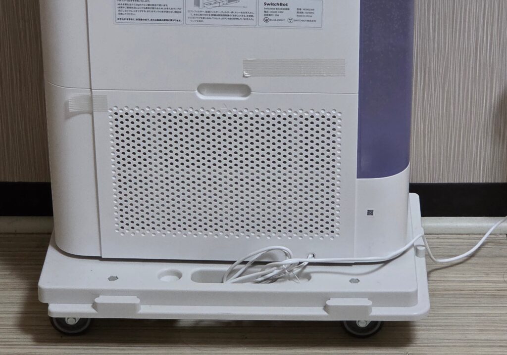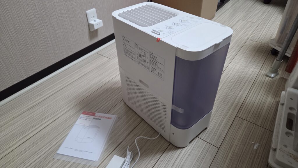 本体サイズ 380×200×402.5mm の6.1kg である。10〜20畳以上の部屋を加湿できるので、リビングキッチンとか広めだと存在感は少し小さくなるが、6畳部屋だと、少しでかい感じはある。