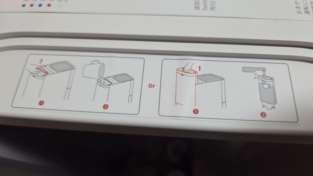 タンク。備えつけたまま大きめのピッチャー、最悪鍋でもいいかも(ただし鍋だと水の落下調整の精度を求められるので、注ぐ際は 外側に向けて水を垂らすこと)で、タンクを本体から取り外して、そのまま蛇口からでも良い。