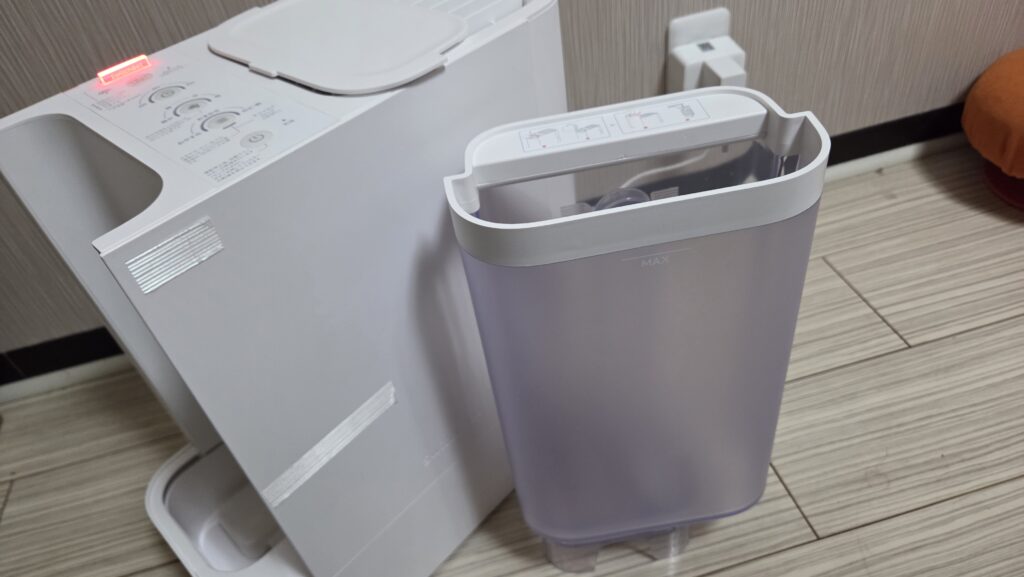一日の乾燥具合によるので一概には言えないが、一晩で半分くらい、1日活動時間 固定湿度維持して空になる感じである。まぁ許容範囲内。想定範囲内。