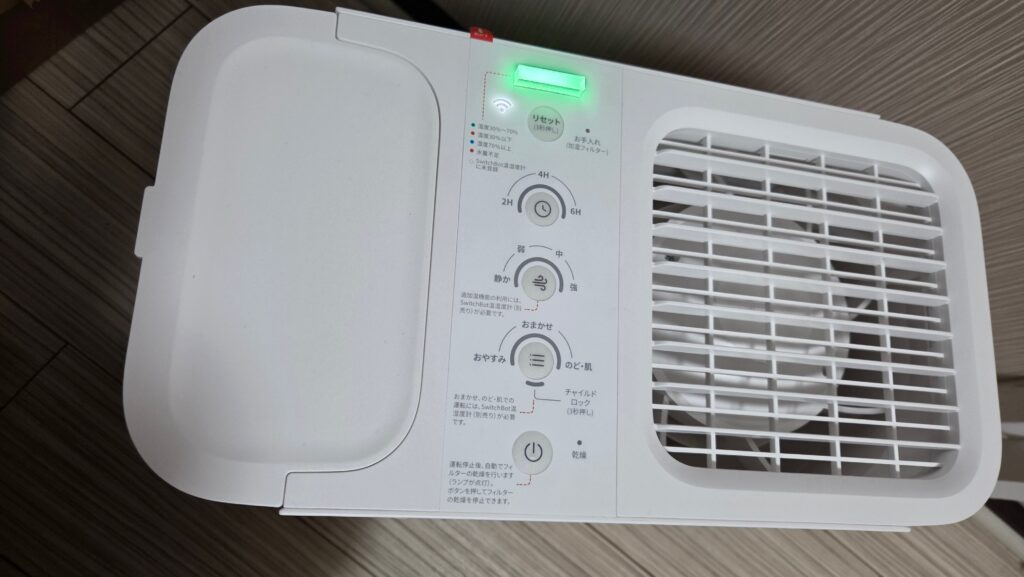 ちなみに連動させると加湿の状況を本体LEDで確認可能。緑だと適正とかといった具合に。