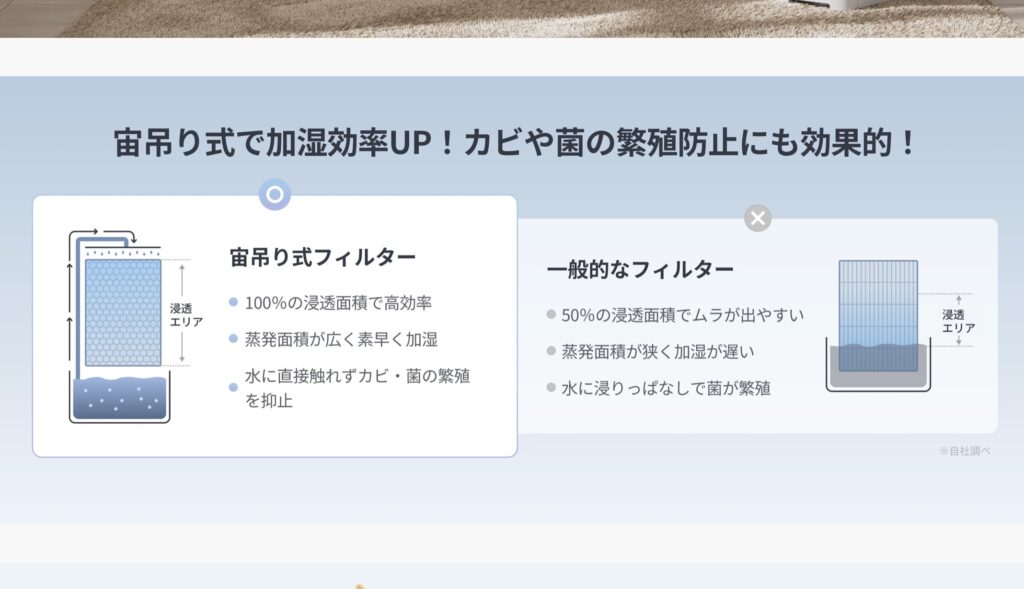 スチーム式や超音波と比べると 本当に加湿しているの感が見えないので、気持ち寂しい。