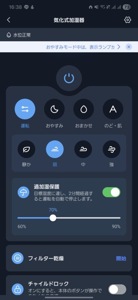 加湿能力は低いが静かなおやすみモード