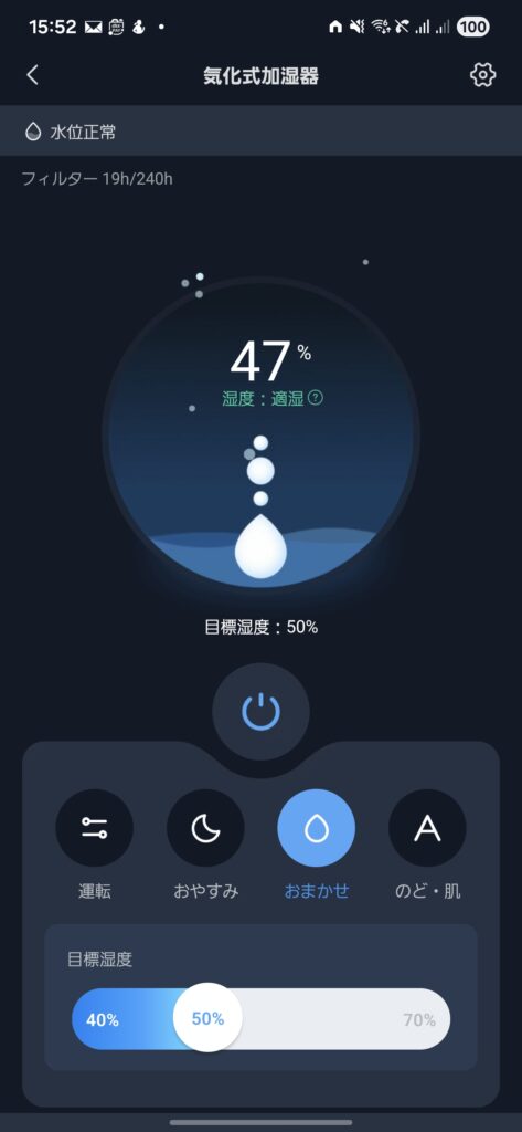あと 約3%下がると再び加湿するのだが、ゆるやかに加湿はしてくれず、ややフル回転加湿してスン、ややフル回転しての繰り返しである。