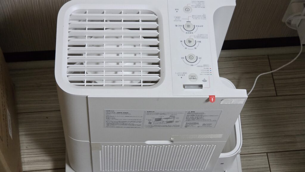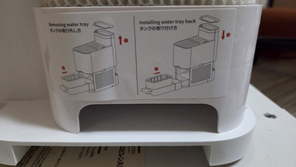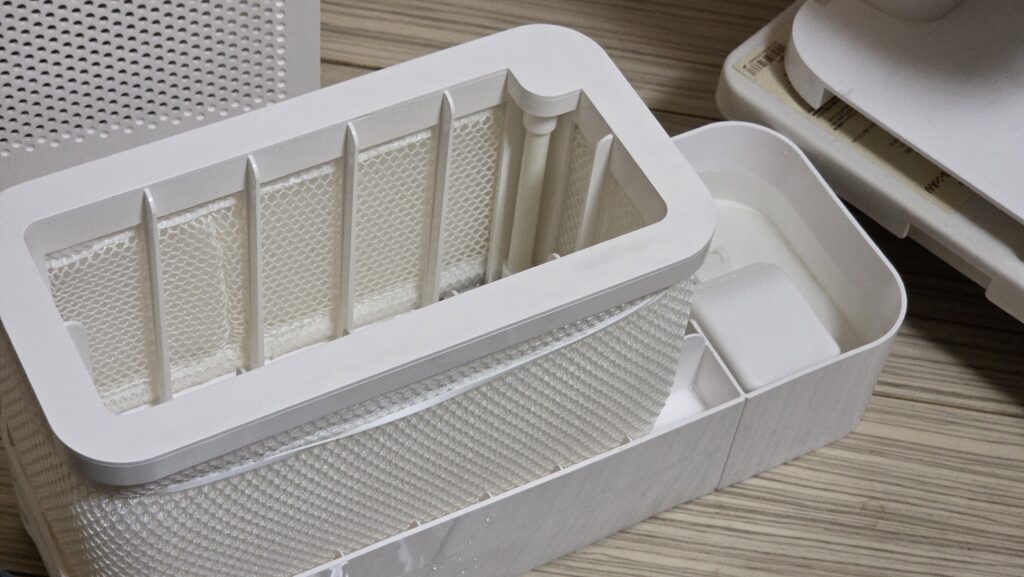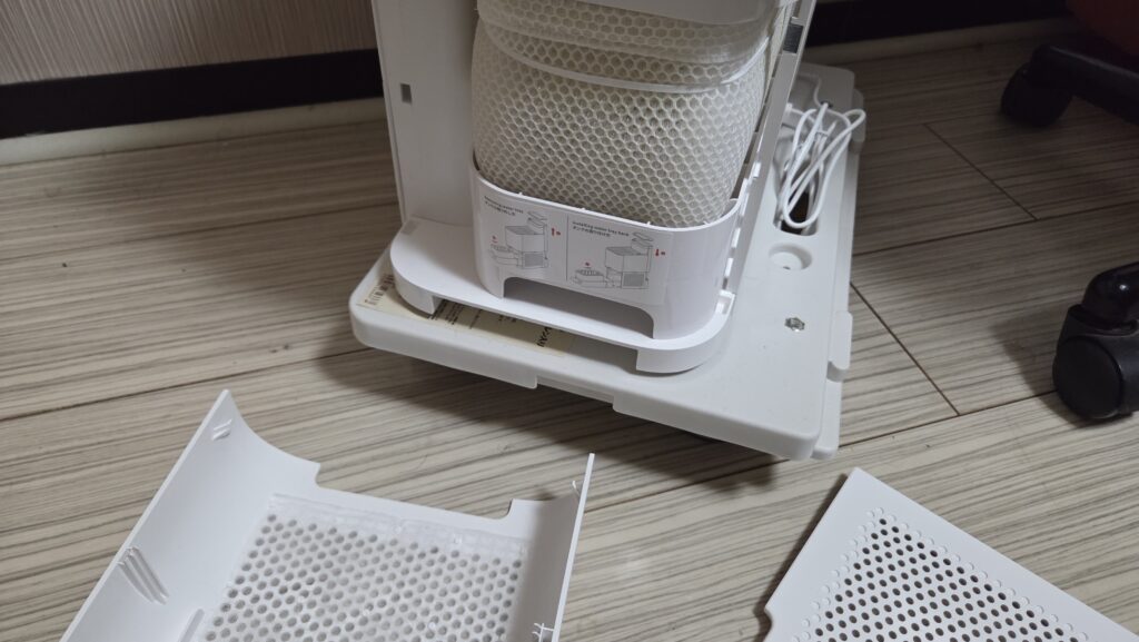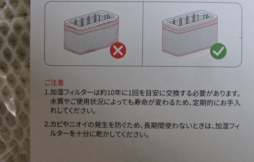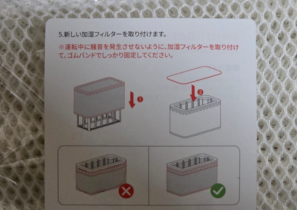 加湿フィルタは少々湿っているので、少し水が垂れる場合があります。(私は初見だったので、床が濡れました。)