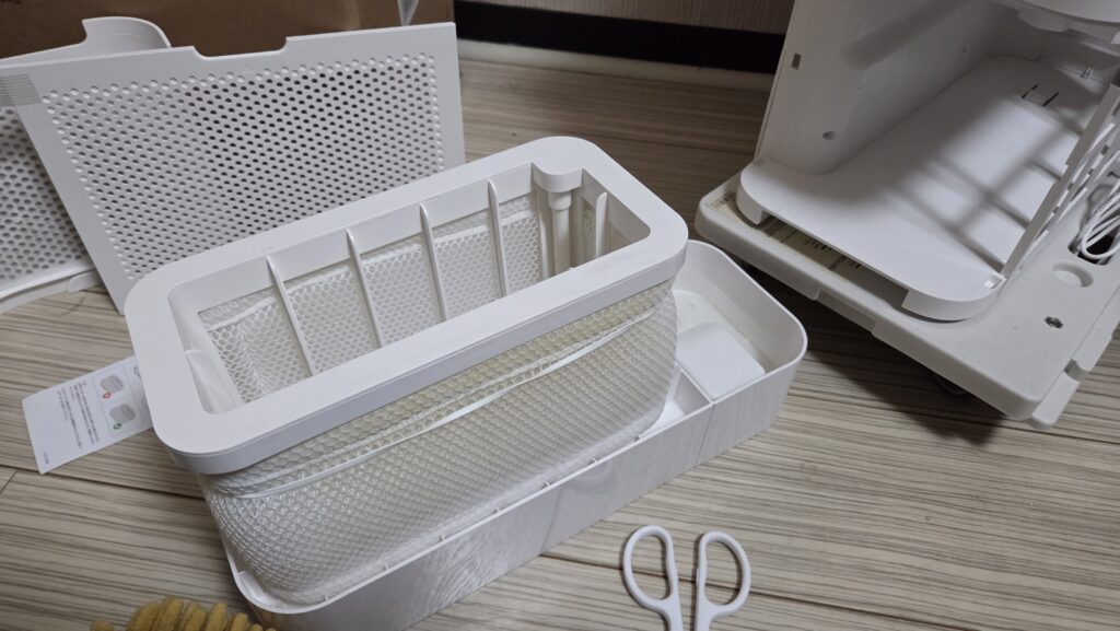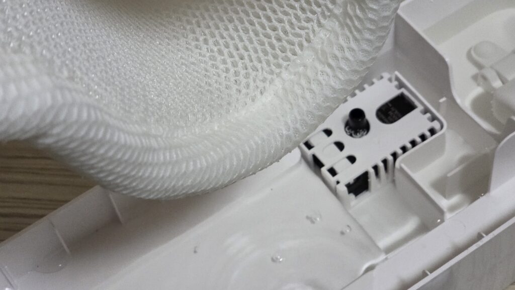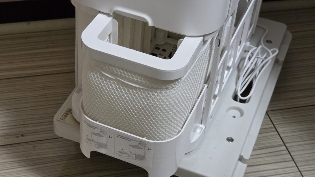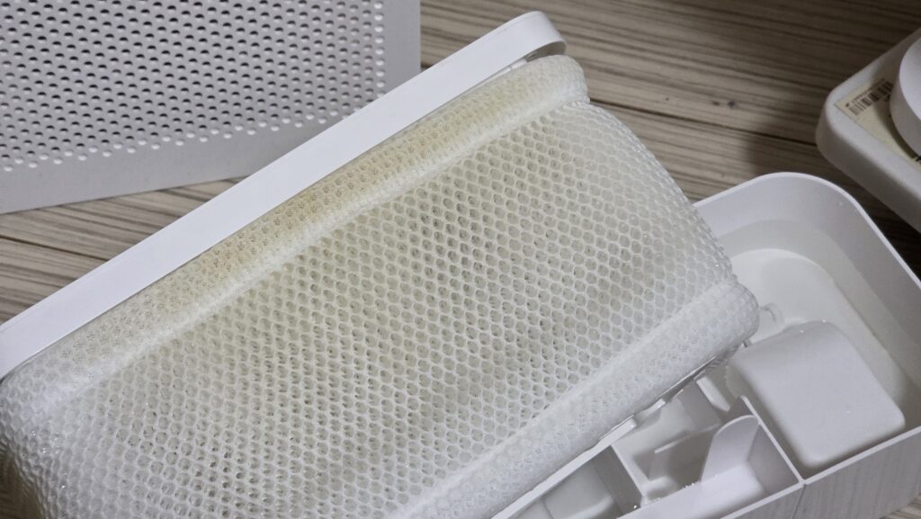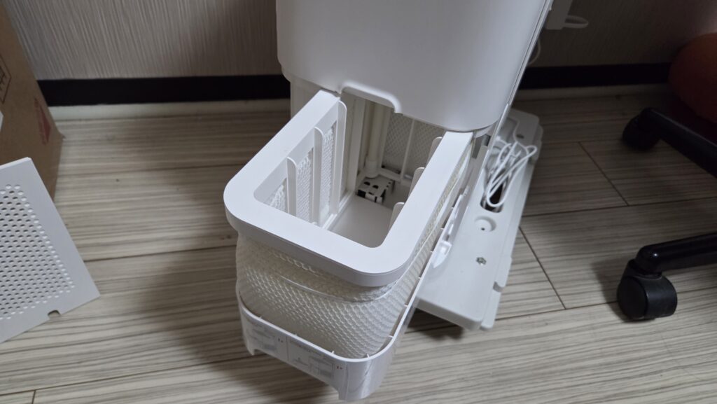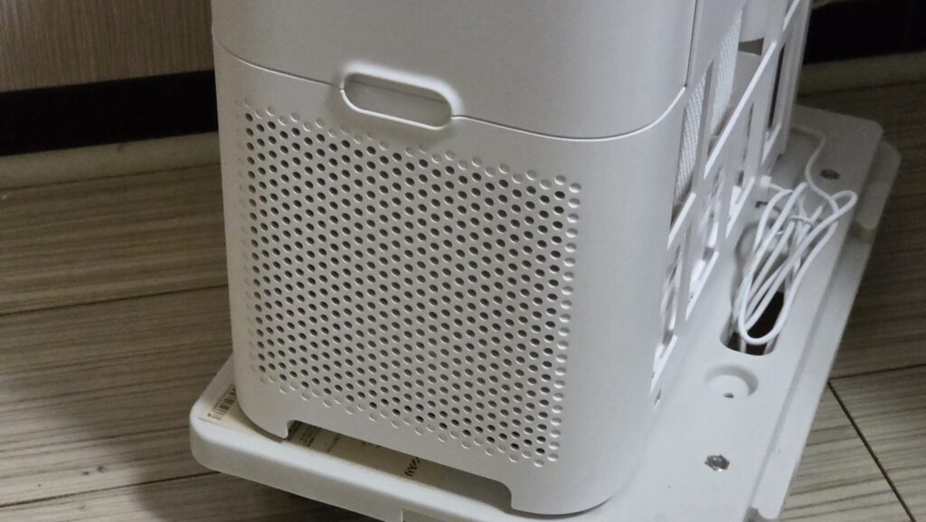 加湿フィルタは少々湿っているので、少し水が垂れる場合があります。(私は初見だったので、床が濡れました。)