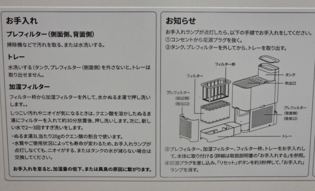 加湿フィルターの汚れのほとんどはカルキでアルカリ性なので、クエン酸が良いです。