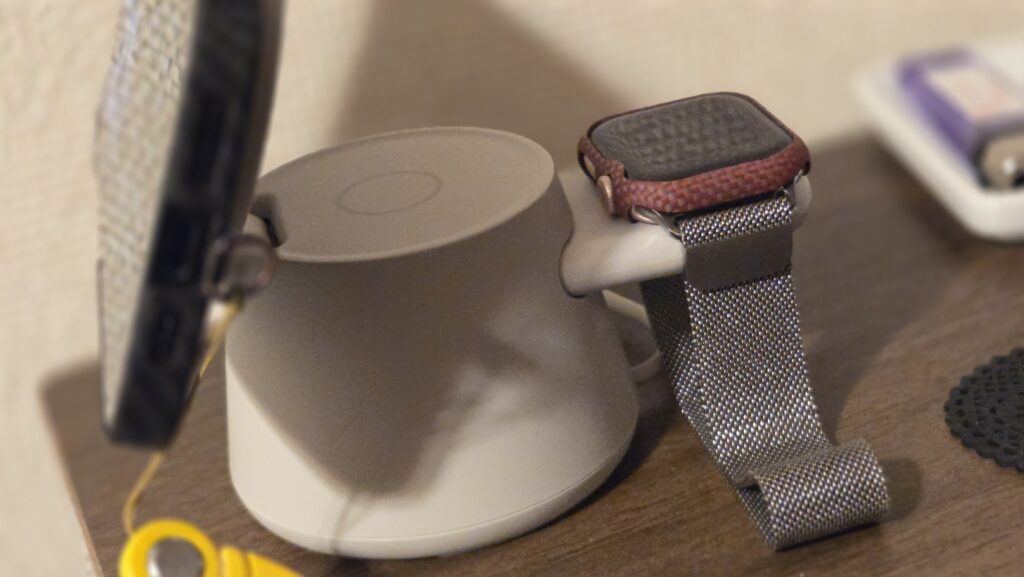 apple watch 固定でなく、固定パーツがあるのは、apple watch 以外も充電できるのです。とても合理的。